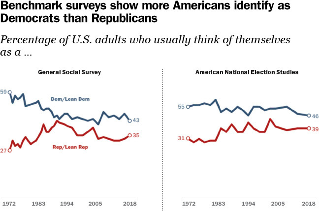 Gold-standard, nonpartisan surveys have found for decades that more U.S. adults identify with or lean toward the Democratic Party than the Republican Party—whether these surveys take place under GOP or Democratic presidential administrations. That is the finding of two of the highest-quality surveys that use nationally representative data collected through in-person interviews: the General Social Survey and the American National Election Studies. It’s also the result obtained by numerous other reputable surveys that poll Americans by telephone or online using randomly selected samples of adults, including those done by us here at the Pew Research Center, as well as those done by Gallup, Fox News, Kaiser Family Foundation and The Associated Press-NORC. (The Census Bureau, which runs the nation’s most authoritative surveys, notably does not ask Americans about their partisan affiliation.)