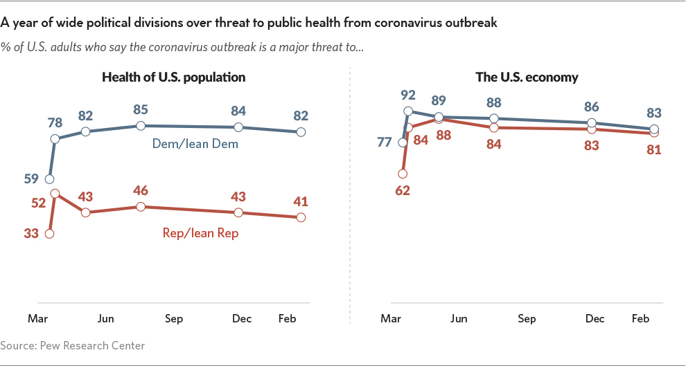 There were already some indications of the partisan divide over the virus in that first sounding. While majorities in both parties anticipated the economic problems hurtling toward the nation, Democrats and Republicans differed sharply over whether the virus was a major threat to the health of the U.S. population. About 6 in 10 Democrats and Democratic-leaning independents (59%) said it was, compared with only a third of Republicans and GOP-leaning independents. That 26-percentage-point gap would grow to around 40 points as spring turned to summer and then fall.