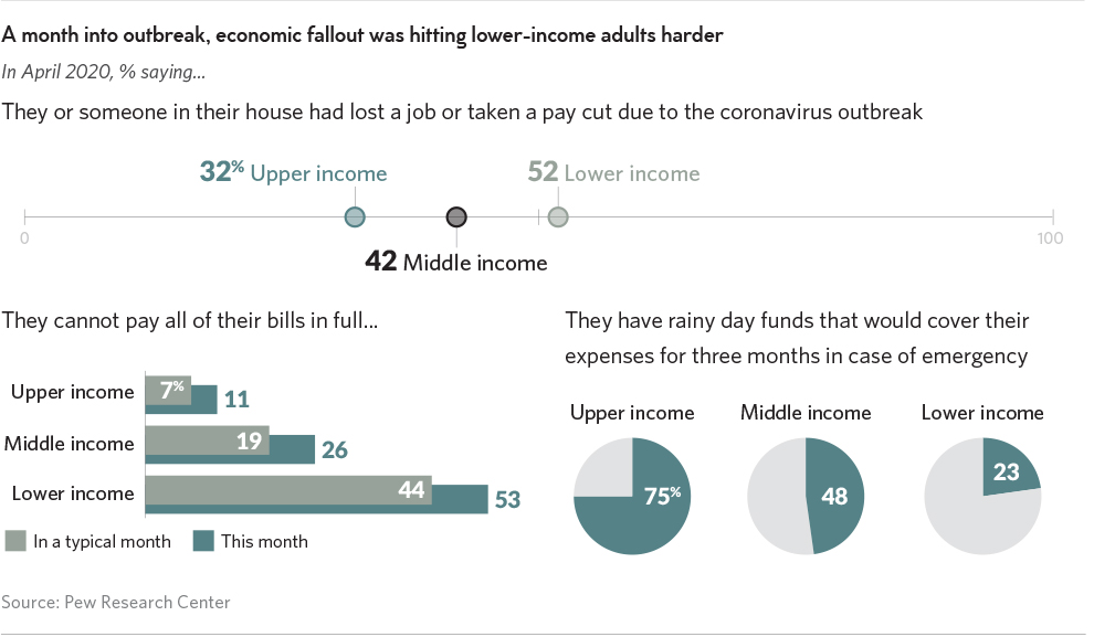 By April, 52% of lower-income Americans said they or someone in their household had lost their job or taken a pay cut, compared with 42% of middle-income adults and 32% of those in the upper income tier. That translated into greater difficulties paying bills: 53% of lower-income adults said they couldn’t pay some of their bills that month, far higher than the proportion of middle- and upper-income Americans who said the same (26% and 11%, respectively).