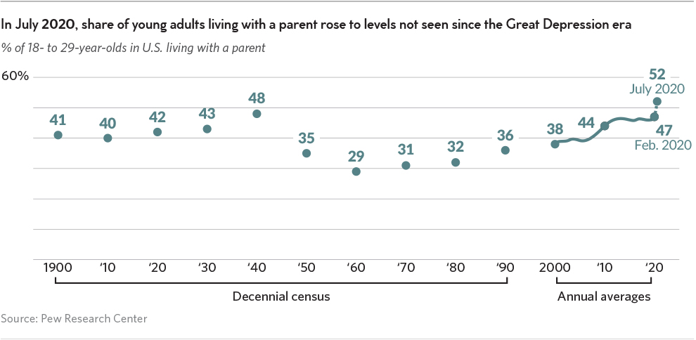 The difficult landscape forced many young adults to move elsewhere. Those ages 18 to 29 were the most likely group to say they had permanently or temporarily moved due to the pandemic. In many cases, they went back to a parent’s home: By July, a 52% majority of adults under the age of 30 were living with at least one parent, up from 47% in February and the highest percentage since the Great Depression.