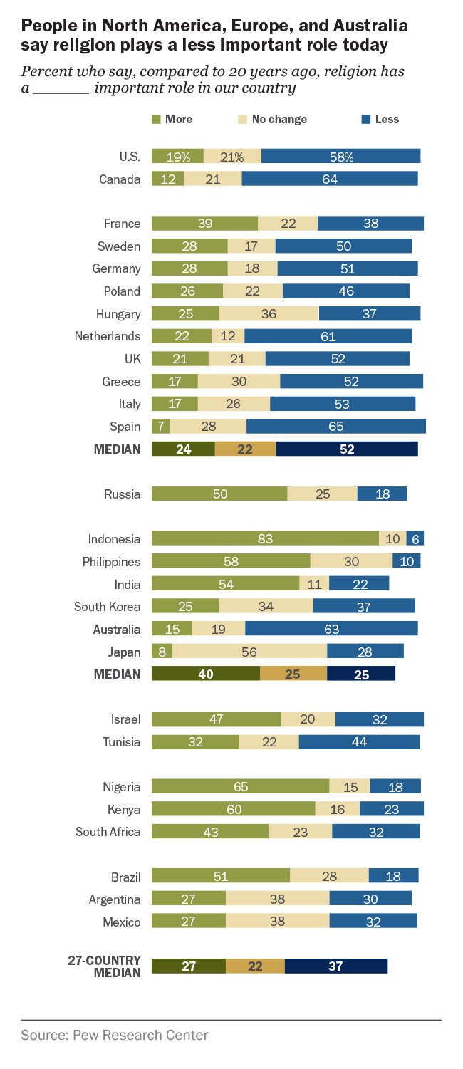Pew researchers asked over 30,000 adults in 27 countries if religion plays a “more important role or a less important role” than it did 20 years ago. It then asked respondents who said religion played a “more important role,” “less important role,” or “no change” how they felt about its perceived waning or waxing status in their country. An additional question asked how important religion is in respondents’ own lives.