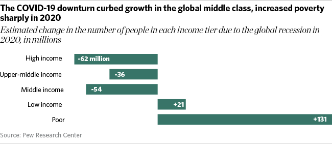 The global middle class encompassed 54 million fewer people in 2020 than the number projected prior to the pandemic’s onset, according to a Pew Research Center analysis. Meanwhile, the number of poor is estimated to have been 131 million higher because of the recession.