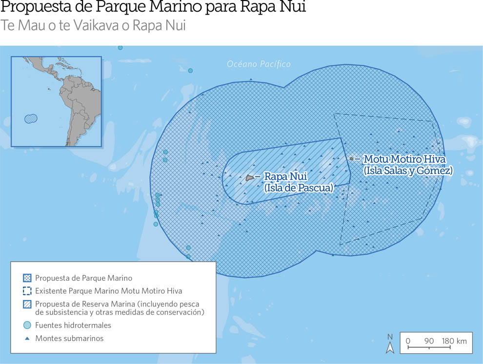 La Isla de Pascua se encuentra a unos 4.000 kilómetros (2.500 millas) al oeste del territorio continental chileno, y sus aguas, en gran parte aún sin explorar, son un verdadero “oasis” en una zona del Océano Pacífico muy pobre en nutrientes; se conoce la existencia de zonas biológicas de gran importancia, incluyendo los únicos respiraderos hidrotermales presentes en aguas chilenas.