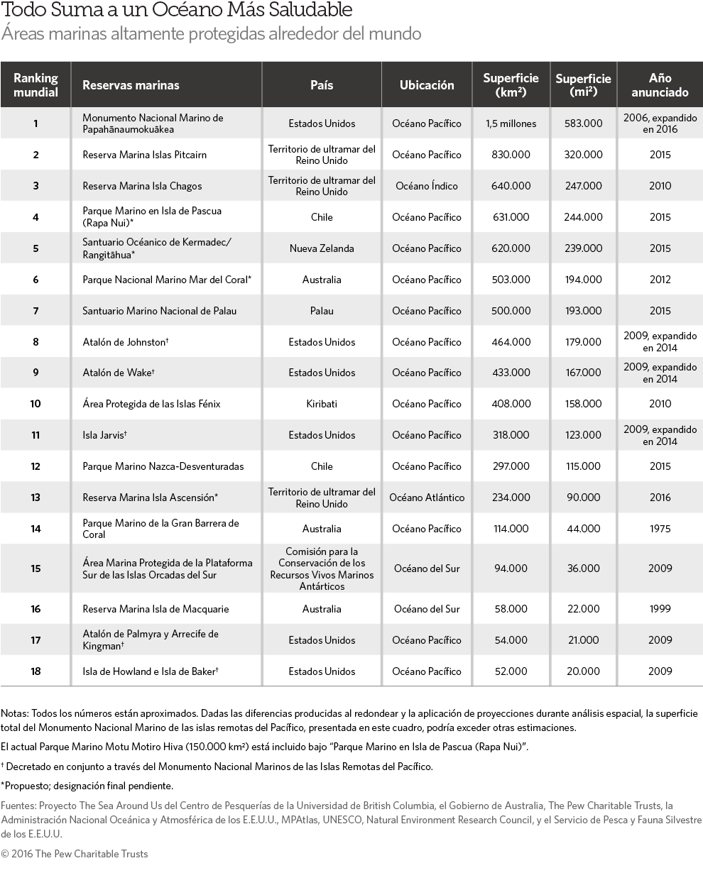El programa Global Ocean Legacy de Pew trabaja con las comunidades locales, los Gobiernos y la comunidad científica para contribuir a la creación de la primera generación mundial de grandes parques marinos. Hasta la fecha, la asociación ha contribuido a duplicar la cantidad de superficie oceánica protegida en todo el planeta. El reconocimiento internacional de la importancia de las grandes reservas marinas totalmente protegidas ha ido creciendo desde que EE.UU. estableció el Monumento Marino Nacional de Papahānaumokuākea (Papahānaumokuākea Marine National Monument), al noroeste de la isla de Hawai, hace casi 10 años. Durante el mes de marzo de este año, el Gobierno británico anunció la creación de la reserva marina de las islas Pitcairn (Pitcairn Islands Marine Reserve), propuesto en 2013 por Pew en asociación con el Pitcairn Island Council; y el 28 de septiembre, el Primer Ministro neozelandés, John Key, anunció la creación de un santuario marino totalmente protegido en las Islas Kermadec, situadas a unos 1.000 km al noreste de la Isla Norte, en Nueva Zelanda.
