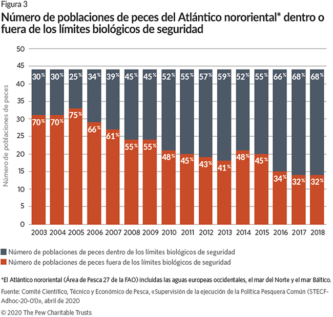 - Se conocen muy pocas poblaciones de peces que se hayan recuperado por encima de los niveles exigidos por la legislación de la UE.8 Un informe encargado por The Pew Charitable Trusts de 2017, «Taking Stock» (Balance pesquero),”9, concluyó que entre el 24% y el 56% seguía estando por debajo de los niveles exigidos por la PPC.