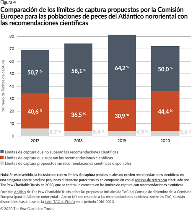 La Comisión puede orientar a los ministros hacia una gestión pesquera responsable mediante la propuesta de límites de captura acordes con las recomendaciones científicas. No obstante, la Comisión a menudo propone límites por encima de las recomendaciones científicas publicadas sin explicar completamente cómo se ha llegado a dichos límites. La Comisión afirma que basa sus propuestas en los datos del Consejo Internacional para la Exploración del Mar (ICES), pero los límites propuestos son normalmente superiores a los recomendados por el ICES. La proporción de límites establecidos por encima de las recomendaciones científicas se han ido reduciendo con el tiempo hasta 2020, año en que el 44% de los límites propuestos están por encima de las recomendaciones. Muchos de estos límites afectan a poblaciones sin recomendación sobre el RMS y en las que se debería seguir el consejo científico de precaución.