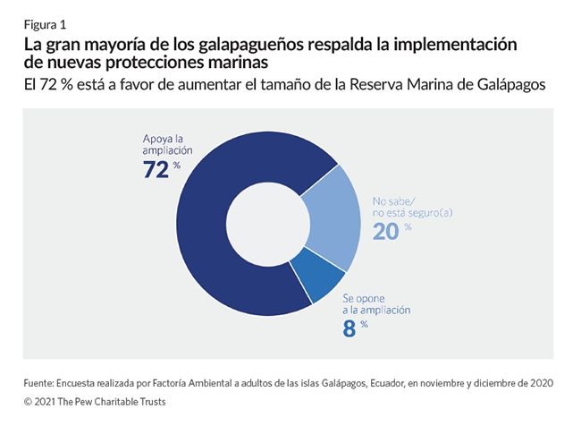 Una nueva encuesta, encargada por el proyecto Legado para los Océanos de Pew Bertarelli y realizada por Factoría Ambiental (una encuestadora galapagueña), demuestra que la comunidad local respalda el aumento de las protecciones para este frágil ecosistema. La encuesta, realizada en noviembre y diciembre de 2020 a 611 personas de las islas Galápagos de Santa Cruz, San Cristóbal e Isabela, reveló que el 72 % de los galapagueños está a favor de ampliar el tamaño de la reserva marina actual, y menciona como principal motivo la oportunidad de mejorar la conservación de los recursos marinos y de reducir o contrarrestar la pesca ilegal que tiene lugar en la zona. Solo el 8 % de los encuestados se opuso a la ampliación del área protegida, y expresó su preocupación en torno a la falta de monitoreo y cumplimiento en el área protegida actual y a la capacidad de operación reducida de los pescadores. El 20 % restante manifestó indecisión respecto de la ampliación del tamaño de la reserva, y mencionó como principal preocupación la capacidad de monitorear correctamente una reserva marina más grande y garantizar su protección efectiva.