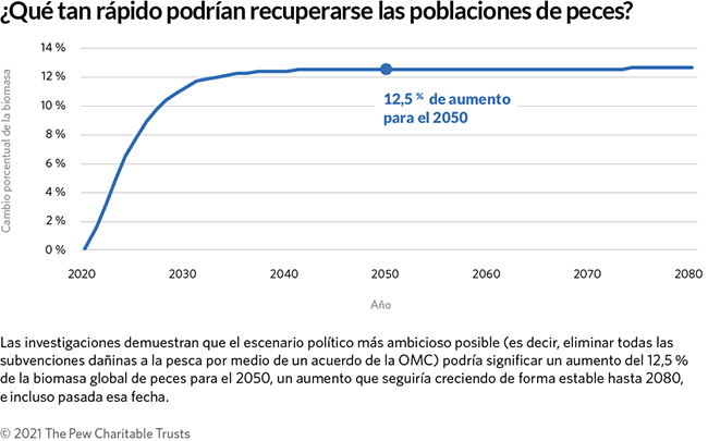 Estas cifras surgen de un modelo bioeconómico —financiado por The Pew Charitable Trusts— que un grupo de científicos de la Universidad de California, Santa Bárbara, creó a partir de datos de acceso público de 2018 (el año más reciente para el cual se tenían datos completos). El modelo fue revisado por economistas independientes y luego se difundió a los miembros de la OMC, quienes actualmente están negociando un acuerdo global que podría eliminar todas las subvenciones dañinas y contribuir a la recuperación significativa de las poblaciones de peces pronosticada por la herramienta.