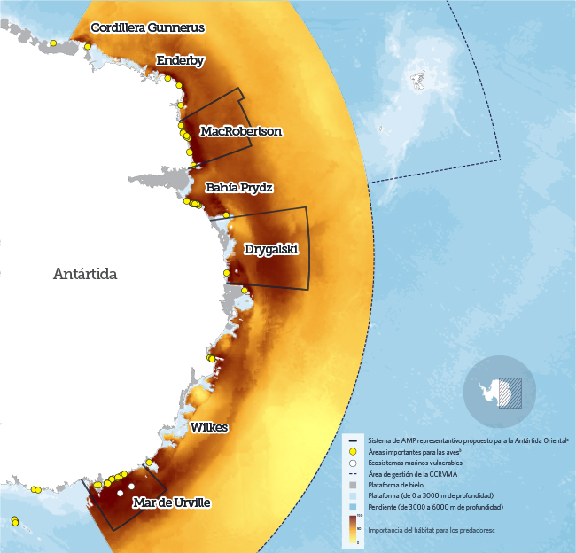 - Designar en los próximos años AMP anteriormente propuestas en las áreas de Gunnerus, Enderby, Bahía Prydz y Wilkes para garantizar la protección total de la Antártida Oriental.