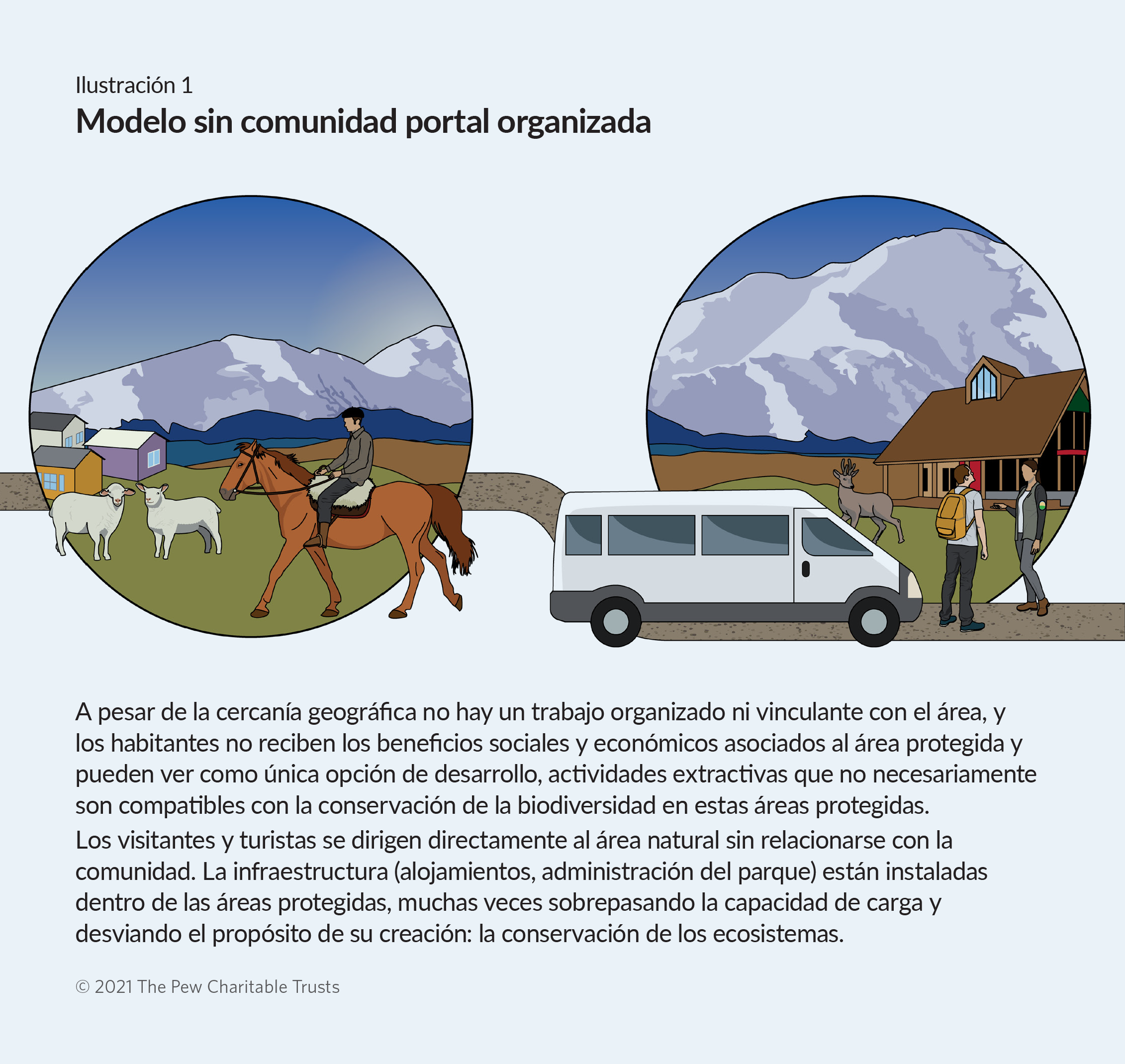 Pese a que históricamente no han sido muy visibilizadas, las comunidades de la Patagonia son fundamentales cuando hablamos de áreas protegidas, porque cohabitan los territorios colindantes, creando una relación de potenciales comunidades portal de dichas áreas. Las comunidades cercanas a áreas protegidas o áreas de alto valor natural, que reconocen tener algún tipo de vinculación con ellas, se pueden definir como “comunidades portal”. La naturaleza de esa conexión es voluntaria y puede ser cultural, ancestral, geográfica o funcional en lo económico o turístico. Ejemplos de esto último ocurre cuando la experiencia de visitación al área protegida comienza y termina en la comunidad local, ya sea por conectividad—senderos, transporte—o por los servicios de información, estacionamiento, comida, alojamiento o cobro de entrada.