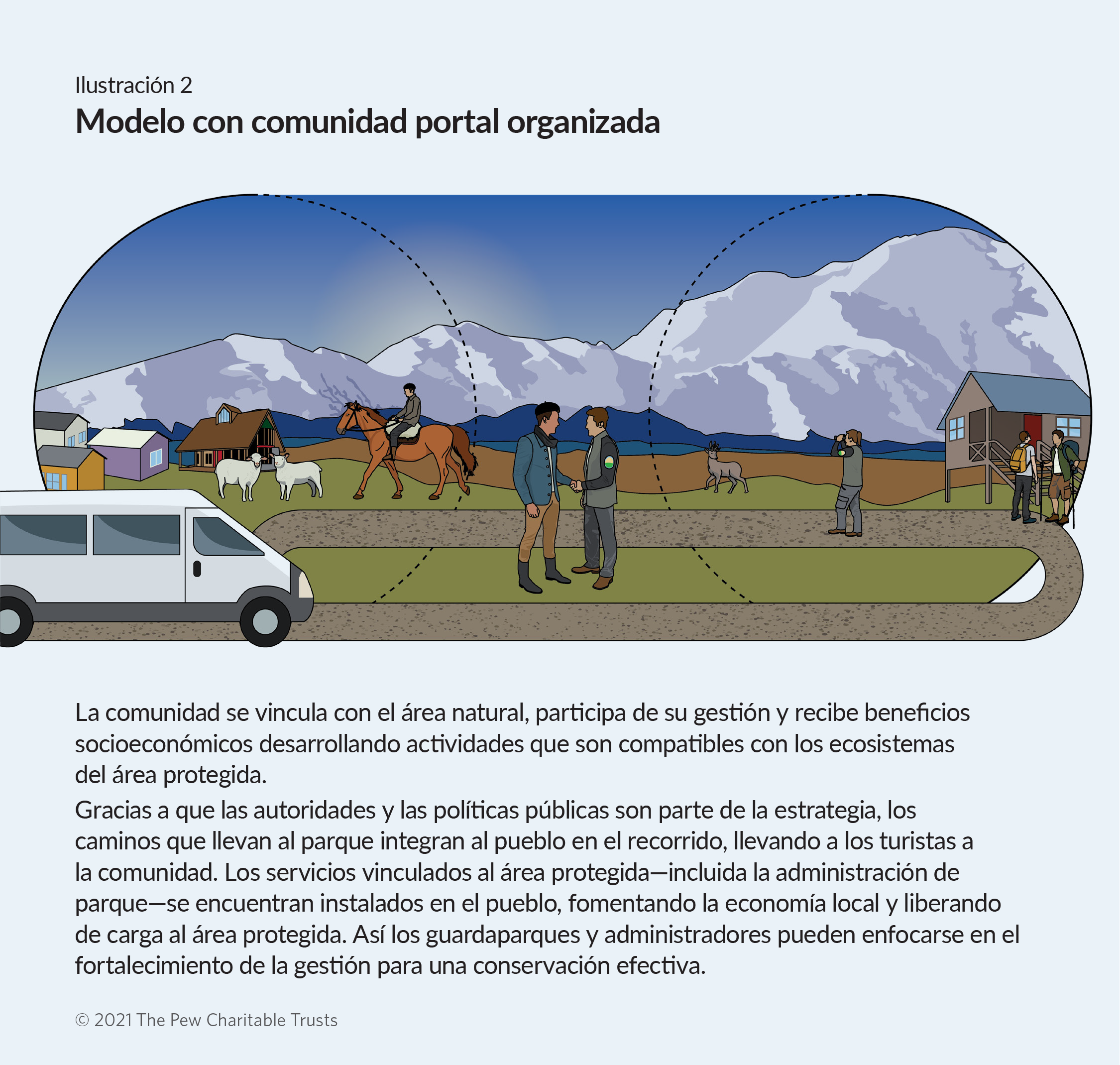 Si la vinculación entre ambos es virtuosa y se coordina adecuadamente con la administración de las áreas protegidas, en este caso con la Corporación Nacional Forestal (CONAF), el Ministerio del Medio Ambiente o el Ministerio de Bienes Nacionales, pueden lograr que, por ejemplo, servicios como alojamientos, alimentación e incluso la administración del parque se instalen fuera de las áreas protegidas y en las comunidades, asegurando ingresos directos a sus habitantes y quitando la presión de crear costosas infraestructuras en el interior del territorio que se busca resguardar.