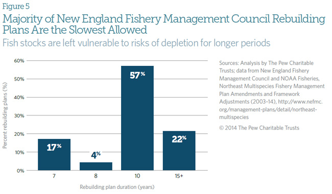 These findings echo those from the NRC report, which noted that in most cases for New England stocks, the longest allowable rebuilding period was selected (typically 10 years). The NRC contrasts this tendency with management council decisions in the Pacific region, which generally resulted in rebuilding periods that were substantially shorter—and therefore less risky. Thanks to those measures, and enhanced monitoring and habitat protection, Pacific fishermen now benefit from having several species receive favorable listings from independent reviews of sustainable fishing, such as the Monterey Bay Aquarium Seafood Watch program.