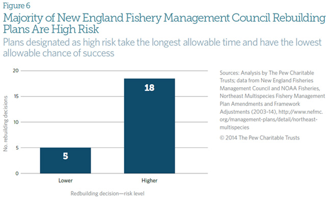 To assess the New England council’s judgments on risk relating to rebuilding plans, Pew researchers focused on two important areas where managers have discretion under the law: the length of time allotted to rebuild a stock and the scientific estimate of a plan’s likelihood of success. The analysis found that most often, the New England Fishery Management Council chose high-risk rebuilding plans.