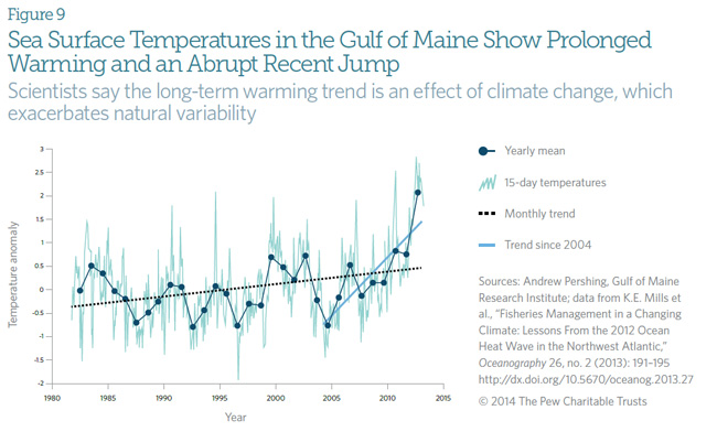 A growing body of scientific evidence shows that the effects of climate change now compound the challenges facing fish populations and the marine ecosystem. Scientists have documented ocean warming in the region and some of its effects on marine life, such as movement in fish populations and disruptions to the food web.48 In 2012, sea surface temperatures in New England rose to their highest levels in the 150 years of instrument data, and 2013 was the second-warmest year on record for the region’s waters.49 Although 2014 temperatures appear to be moderating somewhat, scientists warn that the Gulf of Maine is warming faster than 99 percent of the world’s oceans.50 Researchers called this phenomenon an “ocean heat wave” and say it offers a glimpse of where the long-term temperature trend is going: a future of warmer waters, for which humans must prepare. (See Figure 9.)