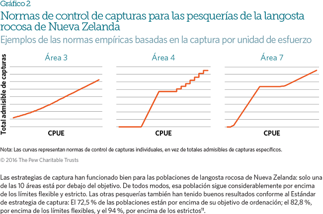 En 1997, Nueva Zelanda comenzó a usar estrategias de captura en sus pesquerías de la langosta rocosa9. Tras una historia de altibajos con los enfoques tradicionales de ordenación, se decidió poner a prueba estrategias de captura con el fin de, primero, reabastecer las poblaciones y, luego, tener altas probabilidades de mantenerlas por encima de los niveles de referencia. Cinco de las diez áreas de langosta rocosa de Nueva Zelanda se ordenan con estrategias de captura, las cuales se revisan cada cinco años y se modifican según sea necesario.
