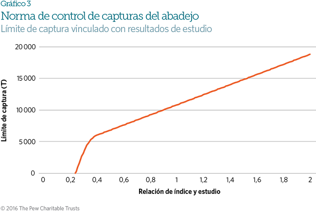 La estrategia de captura del abadejo incluye una HCR empírica, cuyas cuotas se basan en los tres años más recientes de un estudio de investigación sobre abundancia de la población, en la medida que no se observen «circunstancias excepcionales» (consultar Figura 3).