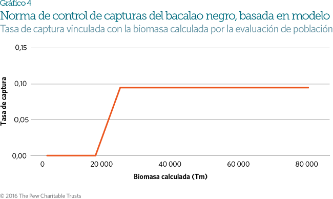 El PO del bacalao negro incluye una HCR basada en modelo. La HCR dictamina que las capturas deben disminuir linealmente desde el momento en que la biomasa caiga por debajo de 0,6 de la BRMS y deben llegar a 0 en 0,4 de la BRMS (consultar Gráfico 4). La HCR del bacalao negro también designa una cuota mínima de 1992 Tm, aproximadamente la mitad del nivel de captura justo antes de la adopción del PO, que se aplicó en el año de pesca de 2015-2016. El bacalao negro todavía está sobrepescado, pero la biomasa ha dejado de disminuir y mostró un leve repunte en 2016.