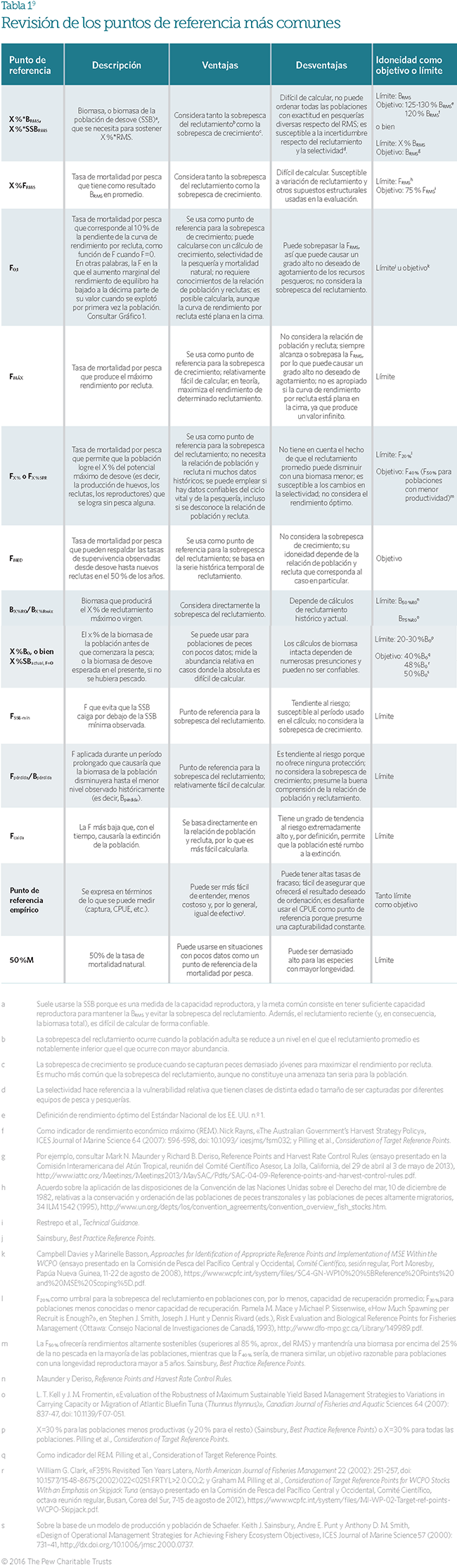 - David J. Die y John F. Caddy, «Sustainable Yield Indicators From Biomass: Are There Appropriate Reference Points for Use in Tropical Fisheries?», Fisheries Research 32 (1997): 69-79, doi: 10.1016/S0165-7836(97)00029-5; Wendy L. Gabriel y Pamela M. Mace, «A Review of Biological Reference Points in the Context of the Precautionary Approach», Proceedings, 5th NMFS NSAW, NOAA Technical Memorandum NMFS-F/SPO-40 (1999), http://www.st.nmfs.noaa.gov/Assets/stock/documents/workshops/ nsaw_5/gabriel_.pdf; Andre E. Punt y Anthony D. M. Smith, «The Gospel of Maximum Sustainable Yield in Fisheries Management: Birth, Crucifixion and Reincarnation», en John D. Reynolds et al. (eds.), Conservation of Exploited Species, (Nueva York: Cambridge University Press, 2001); Sainsbury, Best Practice Reference Points; y Davies y Basson, Approaches for Identification of Appropriate Reference Points.