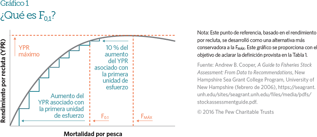Otros sustitutos de la FRMS incluyen la F0,1, la mitad de la tasa de mortalidad natural (50 % de la M), y la FMÁX, aunque esta última a menudo sobreestima la FRMS, por lo que puede ser arriesgada. Por ejemplo, los científicos de la Comisión Internacional para la Conservación del Atún Atlántico (CICAA) usan la F0,1 como el punto de referencia sustituto de la FRMS para la población oriental del atún rojo del Atlántico. Un análisis de los puntos de referencia propuestos para esta población determinó que la F0,1 era el mejor sustituto de la FRMS, aunque la F40% también era sólida19. Sin embargo, la F30% y la FMÁX eran más sesgadas y menos precisas, por lo que los científicos de la CICAA no las consideraron sustitutos adecuados.