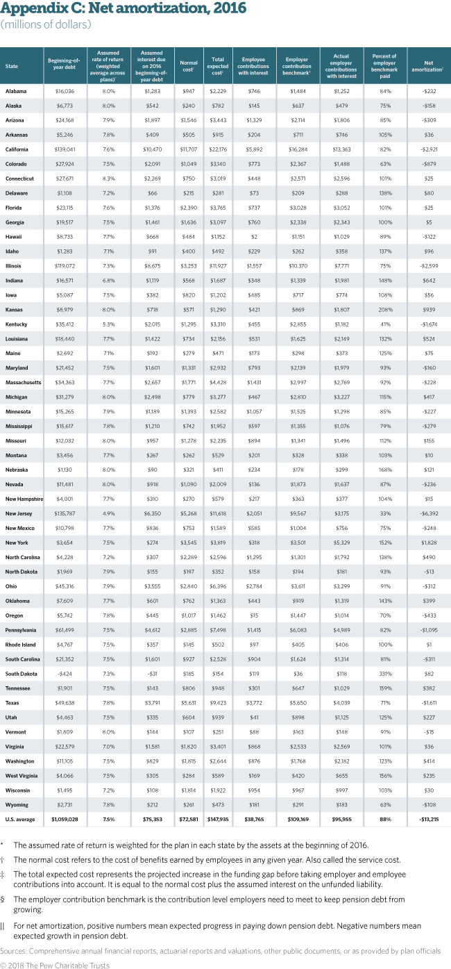 The net amortization benchmark for the required employer contribution is the combined cost of new benefits earned in a given year—known as the service cost—plus the interest on the pension debt minus the expected employee contributions. The interest on the pension debt represents the net pension liability at the beginning of the year multiplied by the assumed rates of return. Employee contributions totaled $39 billion in 2016, after factoring in interest.