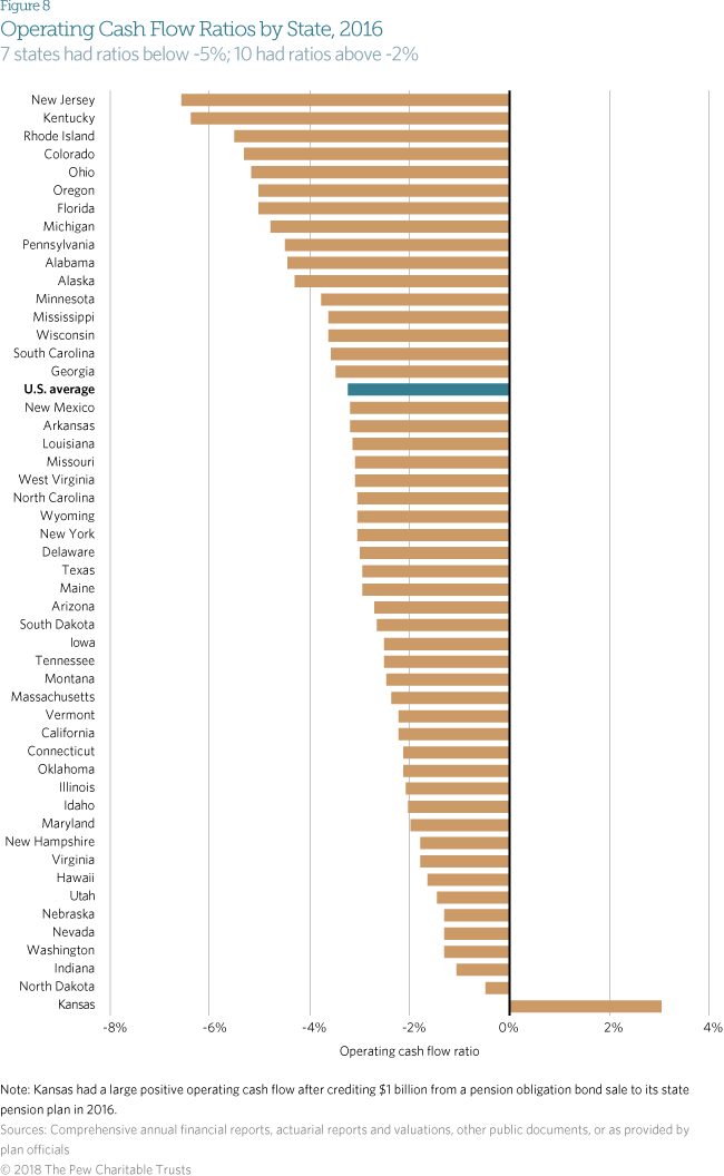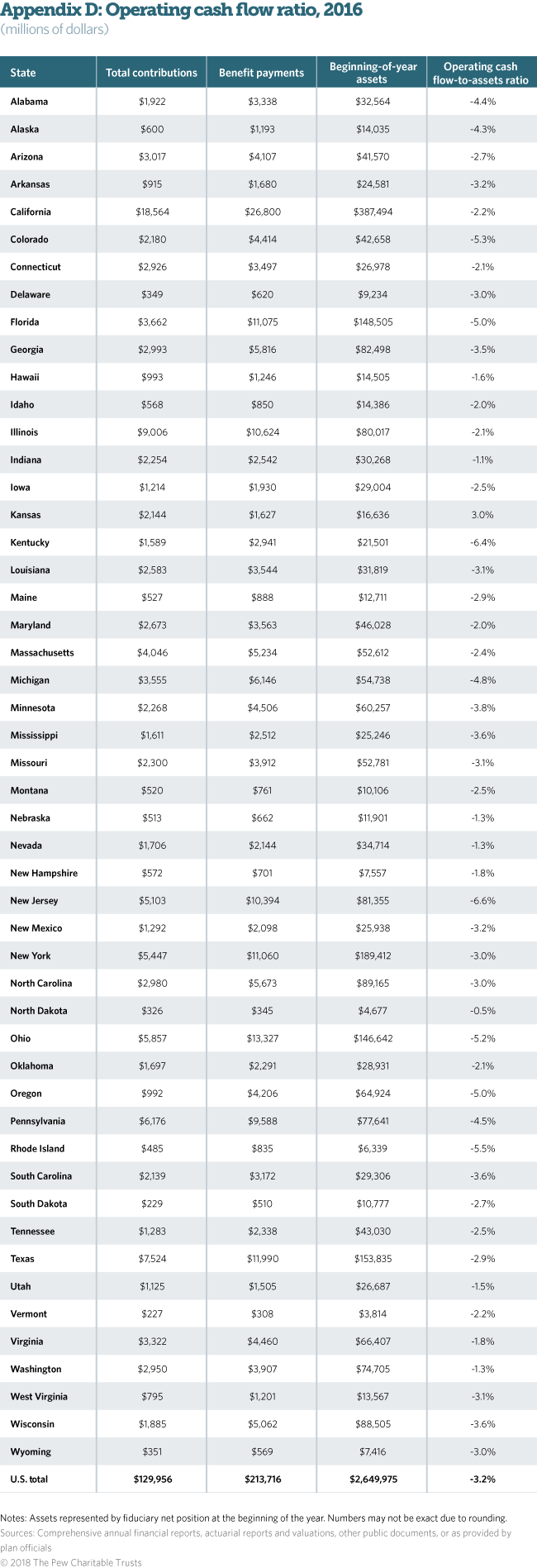 In total, state pension plans paid out $214 billion in pension benefits in 2016, and took in $37 billion in employee contributions and $93 billion from employers. Dividing the cash flow by the total asset value of $2.6 trillion results in an average operating cash flow ratio of 3.2 percent for states in 2016. Seven states had ratios below 5 percent; 10 had ratios above 2 percent.