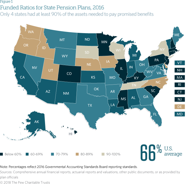 Pew assigns funding data to a year based on the valuation period, rather than when the data are reported. Because of lags in valuation for many state pension plans, only partial 2017 data were available, and fiscal 2016 is the most recent year for which comprehensive data were available for all 50 states. Data on Tennessee aggregate political subdivisions were not available for fiscal 2016, so data were rolled forward from 2015.