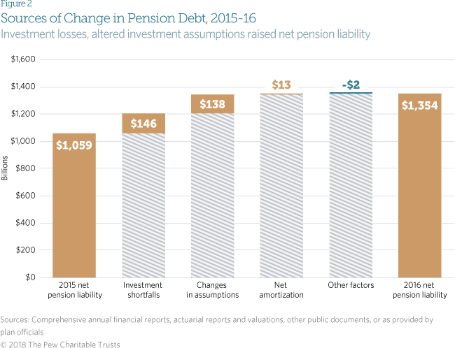 Investment returns that fell short of state assumptions caused a major part of the increase in the funding gap. The median public pension plan’s investments returned about 1 percent in 2016, well below the median assumption of 7.5 percent—a disparity that added about $146 billion to the debt.1 Assumption changes—primarily states lowering the assumed rate of return used to calculate pension costs—accounted for another $138 billion in increased liabilities.