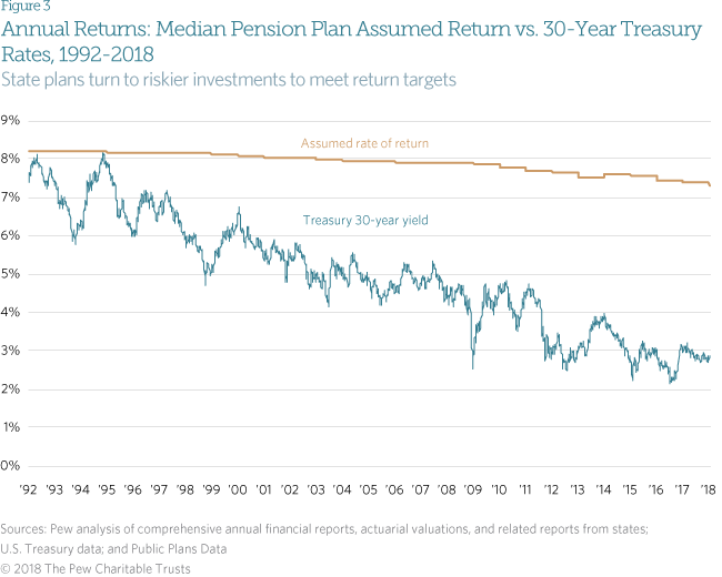 While state pension plans have been lowering their assumed rates of return—from a median of more than 8 percent in 1992 to 7.5 percent in 2016—the level of risk that states take on to meet investment targets has never been higher. Twenty years ago, states needed only to exceed the yield on a 30-year Treasury bond by 1 percentage point to meet their investment targets. Currently, the typical state would need to outperform a 30-year Treasury bond by 5.2 percentage points to meet its now-lower investment assumption. That reality has forced plans to take on higher levels of investment risk. (See Figure 3.)