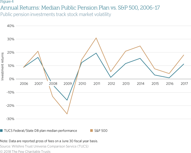 The share of public funds’ investments in stocks, private equity, and other risky assets has increased by over 30 percentage points since 1990—to over 70 percent of the portfolio of state pension plans. As a result, pension plan investment performance now closely follows equity returns.4 (See Figure 4.)