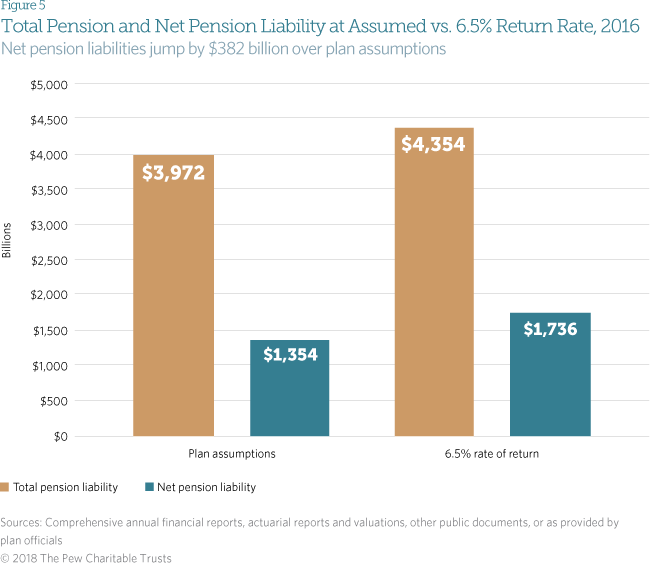 Even small changes to projected returns can significantly increase liabilities. Pew applied a 6.5 percent return assumption, instead of the median assumption of 7.5 percent, to estimate the total liability for state pension plans and found that it would increase to $4.4 trillion—$382 billion more than the current amount. The funding gap would then jump to $1.7 trillion.
