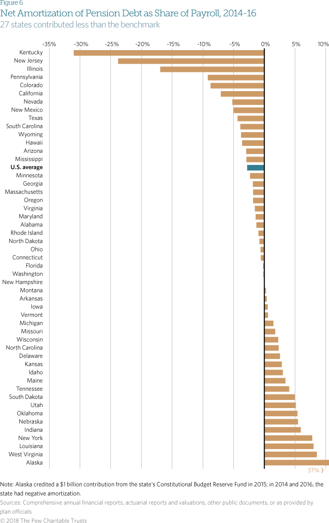Figure 6 shows net amortization as a share of payroll for each state from 2014 to 2016. Factoring in total payroll helps to normalize the results of states of different sizes; it also allows the number to be expressed as the increase in the contribution rate a state would have needed in order to achieve positive amortization over that period. Because volatile investment returns, among other factors, can cause the benchmark to fluctuate, aggregating over three years gives a better picture of the long-term trend.