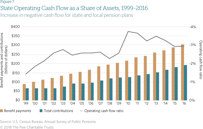 A new indicator, the operating cash flow ratio, represents the difference between financial outflows (primarily benefit payments) and cash coming in before investments (primarily employer and employee contributions) divided by the level of assets at the beginning of the year. A plan with an operating cash flow ratio of 3 percent, for example, would need to achieve investment returns of at least 3 percent that year to keep assets from dropping.