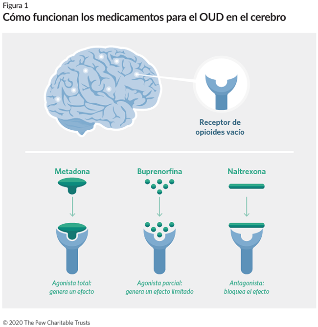 - The Pew Charitable Trusts, “Medication-Assisted Treatment Improves Outcomes for Patients With Opioid Use Disorder” (El tratamiento farmacológico mejora los resultados para pacientes con trastorno por consumo de opioides), (2016), https://www.pewtrusts.org/-/media/assets/2016/11/medicationassistedtreatment_v3.pdf; Administración Nacional de Alimentos y Medicamentos de los EE.UU., “Information About Medication-Assisted Treatment (MAT)” (Información sobre el tratamiento farmacológico - MAT)” acceso el 15 de agosto de 2019, https://www.fda.gov/drugs/information-drug-class/information-about-medication-assisted-treatment-mat.