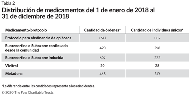 Una vez resuelto el atraso inicial de las detecciones, se estabilizó el número de pacientes que comenzaban el tratamiento con medicamentos para tratar el OUD cada mes. En un día, el DOC tiene aproximadamente 550 pacientes en tratamiento con buprenorfina y 70 con metadona. Solo un pequeño número de pacientes toma naltrexona oral. Un vistazo diario del 21 de mayo de 2019 indicó que el 60 % de las mujeres y el 40 % de los hombres encarcelados estaban recibiendo medicamentos y se les había ofrecido recibir apoyo psicológico para tratar el OUD.41