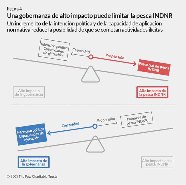 Tal como se observa en la Figura 4, el modelo demuestra el impacto que tiene mejorar la capacidad de actuación en la propensión de los pescadores a realizar actividades de pesca ilegal, no declarada y no reglamentada. Si un país tiene la capacidad suficiente para actuar, la probabilidad de que se produzca la pesca INDNR disminuye, con los consiguientes beneficios para las poblaciones de peces, lo que garantiza la sostenibilidad de la cadena de suministro de pescados y mariscos.