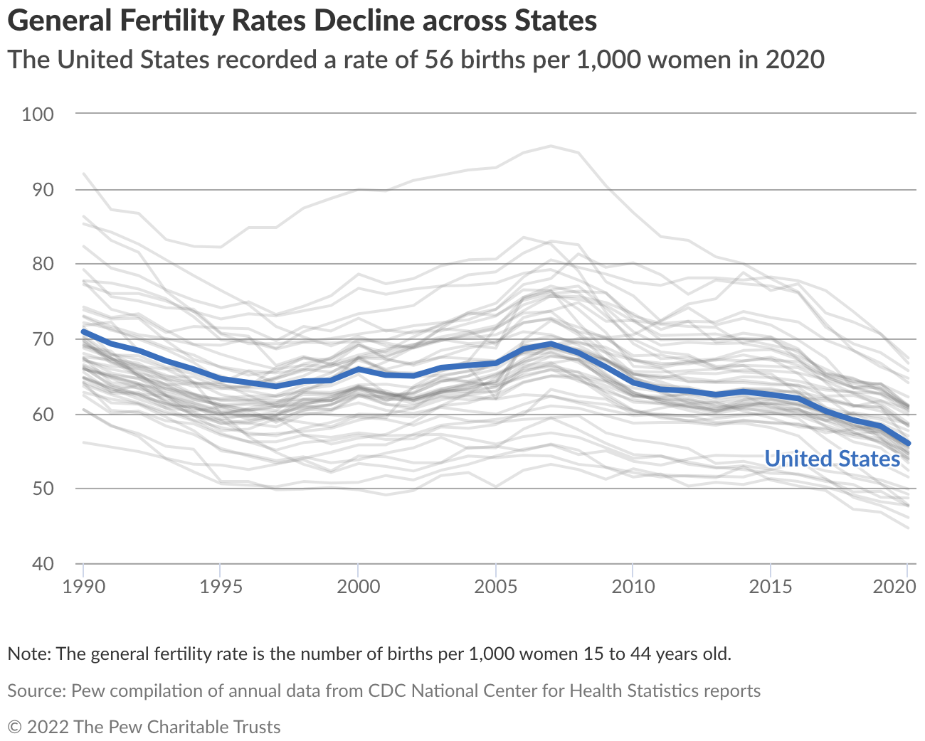 - Forty-three states recorded their lowest general fertility rate, which represents annual births per 1,000 women aged 15-44, in at least three decades in 2020.
