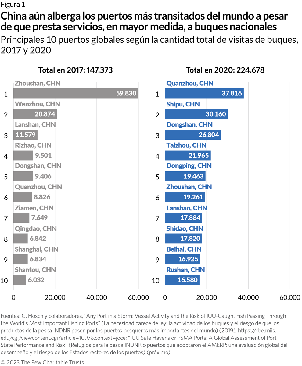 En 2020, al igual que en 2017, China albergó los 10 puertos principales de todo el mundo según la cantidad total de visitas de buques pesqueros y cargueros, y los buques nacionales representaron la mayoría de los desembarques. (Consulte la figura 1). Sin embargo, entre estos años, los puertos que se utilizan en China cambiaron, y el tráfico total de buques aumentó un 50 %, muy probablemente, debido a una mejora de los algoritmos de detección del AIS y al hecho de que los investigadores utilizaron otro proveedor de datos del AIS que proporcionó más datos de pesca interior.