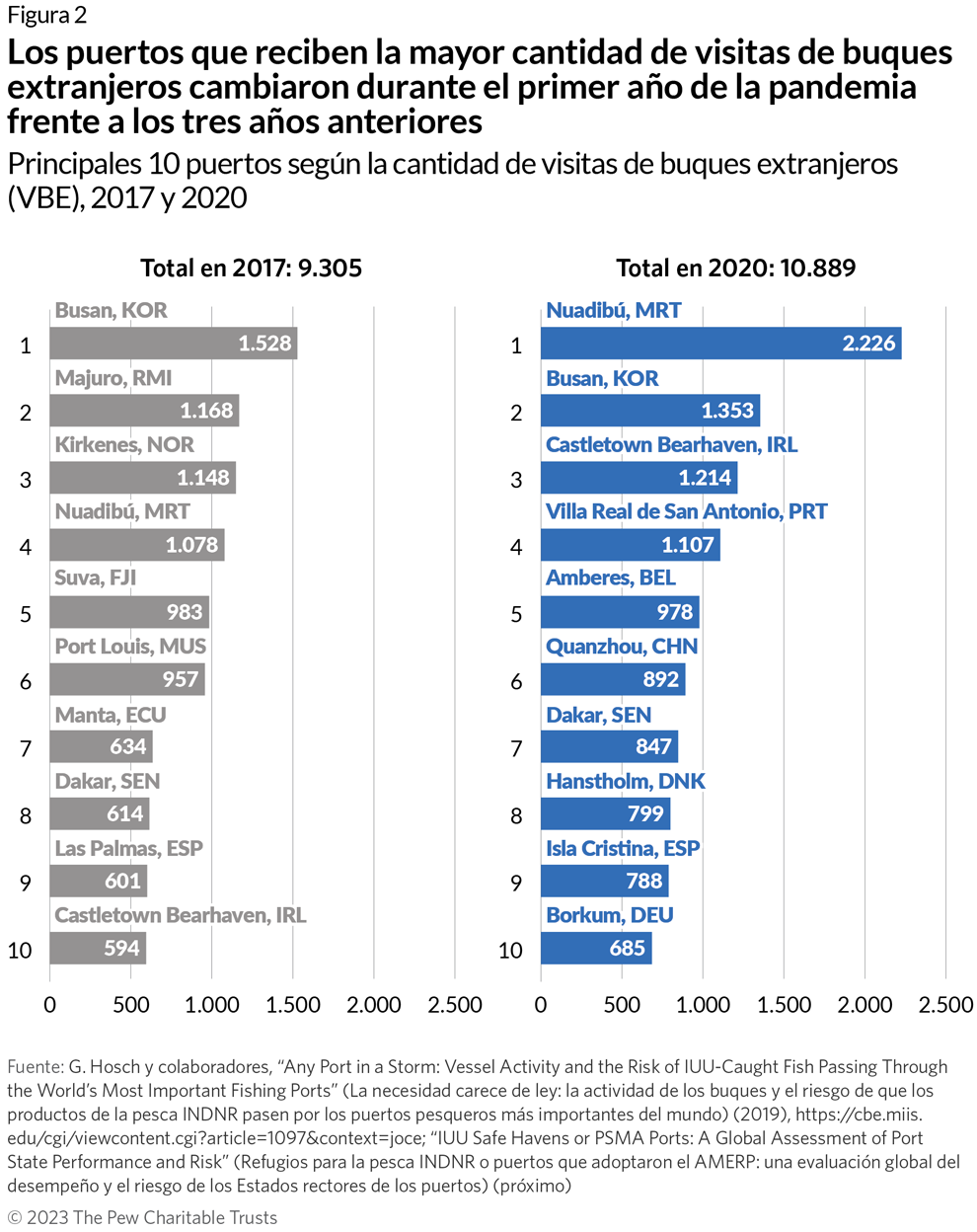 Para identificar las deficiencias en la implementación del AMERP, The Pew Charitable Trusts encargó un estudio (a ser publicado próximamente) revisado por pares a cargo de investigadores de las compañías Poseidon Aquatic Resource Management y Global Fishing Watch que se publicará en la revista Marine Policy en 2023.3 El equipo de investigación utilizó los datos de posicionamiento transmitidos por buques de carga y pesqueros en 2020 a través del Sistema de Identificación Automática (AIS, por sus siglas en inglés) y otra información de dominio público para clasificar los puertos pesqueros de los Estados costeros según diversas medidas, entre ellas, las visitas de buques extranjeros y el tamaño de las bodegas de los buques pesqueros y cargueros. De esta manera, intentaron determinar qué países presentaban un mayor riesgo de que los productos de la pesca ilegal ingresaran al mercado a fin de poder identificar los puertos donde la implementación efectiva del AMERP tendría un mayor impacto.