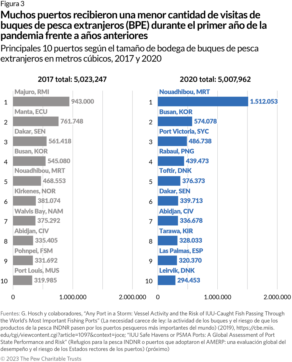Entre los dos estudios, los cambios en la cantidad de visitas de buques fueron muy similares a los cambios en el tamaño de las bodegas de los buques pesqueros extranjeros que visitaban dichos puertos. (Consulte la figura 3). Por ejemplo, el tamaño de las bodegas de los buques que visitaron Nuadibú se triplicó en 2020, frente a 2017, mientras que, en Majuro, el tamaño de las bodegas disminuyó al menos en un 60 %. Entre los dos estudios, los cambios en la cantidad de visitas de buques fueron muy similares a los cambios en el tamaño de las bodegas de los buques pesqueros extranjeros que visitaban dichos puertos. (Consulte la figura 3). Por ejemplo, el tamaño de las bodegas de los buques que visitaron Nuadibú se triplicó en 2020, frente a 2017, mientras que, en Majuro, el tamaño de las bodegas disminuyó al menos en un 60 %.