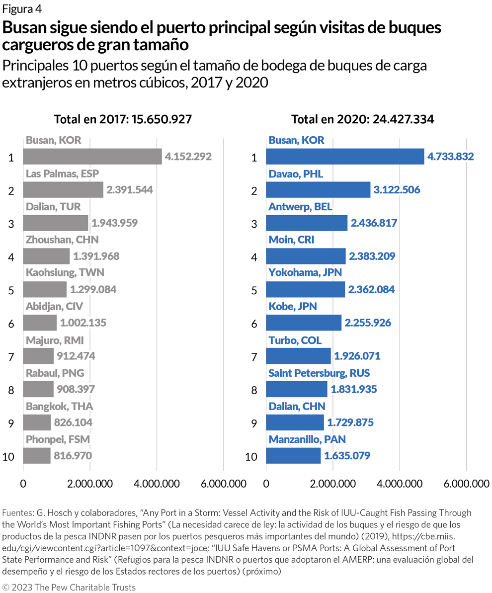 En este análisis, se descubrió que, desde la realización del primer estudio, la cantidad total de visitas de buques extranjeros aumentó y los puertos visitados cambiaron notablemente. (Consultar la figura 2). Por ejemplo, en Nuadibú, Mauritania, hubo un aumento de más del 100 % en la cantidad de visitas de buques extranjeros. Como resultado, la clasificación de este puerto pasó del quinto lugar en 2017 al primero en 2020. La mayoría de los buques de pesca extranjeros que realizaron el desembarque en Nuadibú tenían bandera de Turquía (930 visitas), China (299), España (293) y Camerún (183). Por otro lado, las visitas a Busan, Corea del Sur, disminuyeron en poco más del 10 %, por lo tanto, el puerto pasó del primer lugar al segundo en la clasificación, y la mayoría de las visitas provenían de Rusia, tanto buques pesqueros como cargueros (837 visitas), China (178) y Panamá (146).