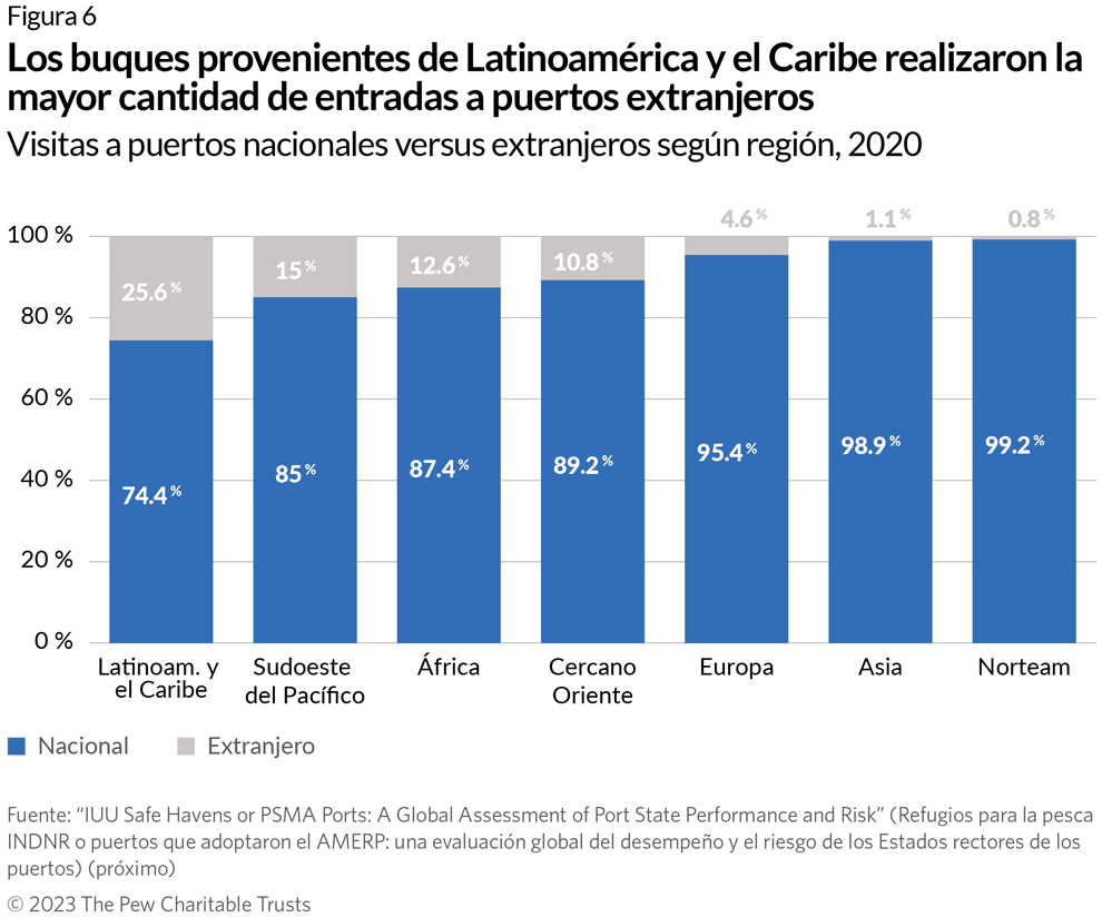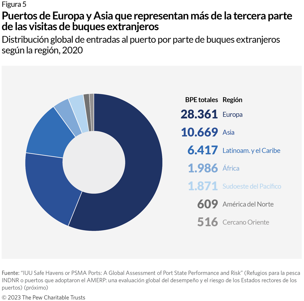 A nivel global, los puertos europeos recibieron la mayor cantidad de visitas de buques extranjeros, la mayoría de los cuales provenía de otros países de la Unión Europea. Los puertos de Asia y Latinoamérica y el Caribe obtuvieron el segundo y el tercer lugar en lo referente a las visitas de buques extranjeros, respectivamente. (Consulte la figura 5). El resto de las regiones constituyen menos del 10 % de la totalidad de las visitas de buques extranjeros.