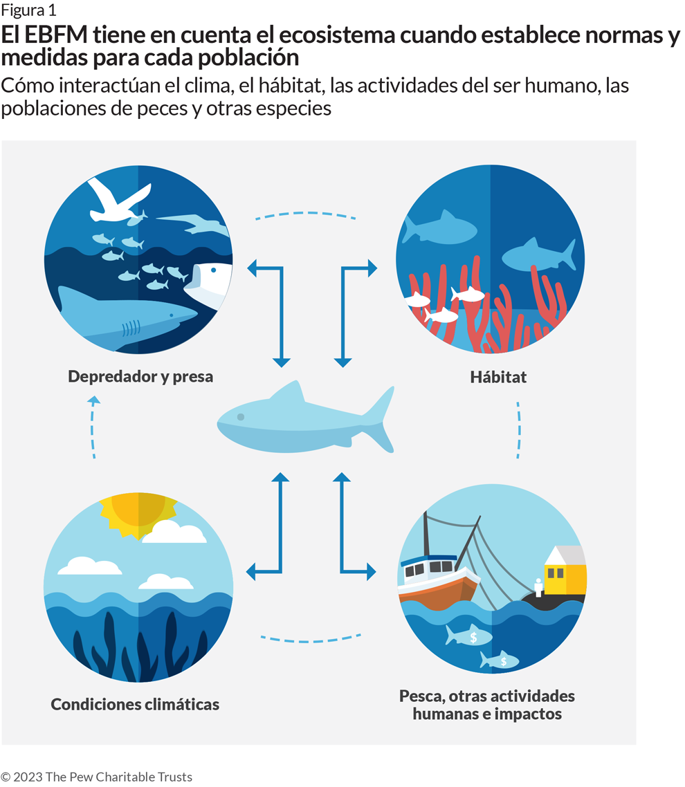 En lugar de considerar una especie de manera aislada, como se hace en el manejo de pesquerías tradicional, el EBFM tiene en cuenta el hecho de que cada pez forma parte de un complejo sistema ecológico. El EBFM tiene en cuenta el resto de las especies, incluidos los seres humanos; los cambios en el hábitat; y las condiciones climáticas que afectan a todas las especies de peces. Asimismo, las poblaciones de peces, y las pesquerías que los capturan, afectan el ecosistema, por ejemplo, a través de las relaciones entre depredadores y presas o cuando las artes de pesca causan daños al hábitat. (Consulte la figura 1). La ciencia detrás del EBFM se encuentra en crecimiento y bien afianzada, y los gerentes identificaron el EBFM como una estrategia para cumplir con su compromiso de gestionar y proteger los ecosistemas marinos de manera sustentable