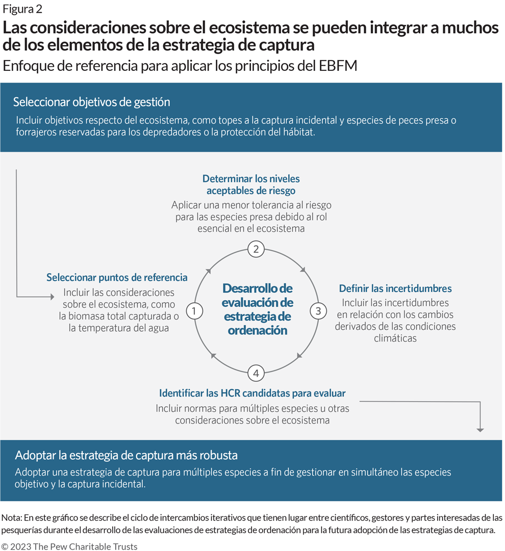 A la fecha, el empleo de la MSE se centró en especies individuales, pero para avanzar hacia el EBFM, cuando corresponda, los gestores deberían aplicar este marco a múltiples especies o a las relaciones de mayor alcance que se dan en el ecosistema, en particular, en el caso de las pesquerías que capturan varias especies o que usan carnada a partir de poblaciones naturales.8 Por ejemplo, hace poco, la Comisión Internacional para la Conservación del Atún Atlántico (CICAA) completó una MSE para evaluar los impactos de gestión sobre dos poblaciones de atunes rojos del Atlántico diferentes pero vinculadas.9 Un enfoque similar podría usarse para dos o más especies, ya sea que sean especies objetivo de las pesquerías o captura incidental.
