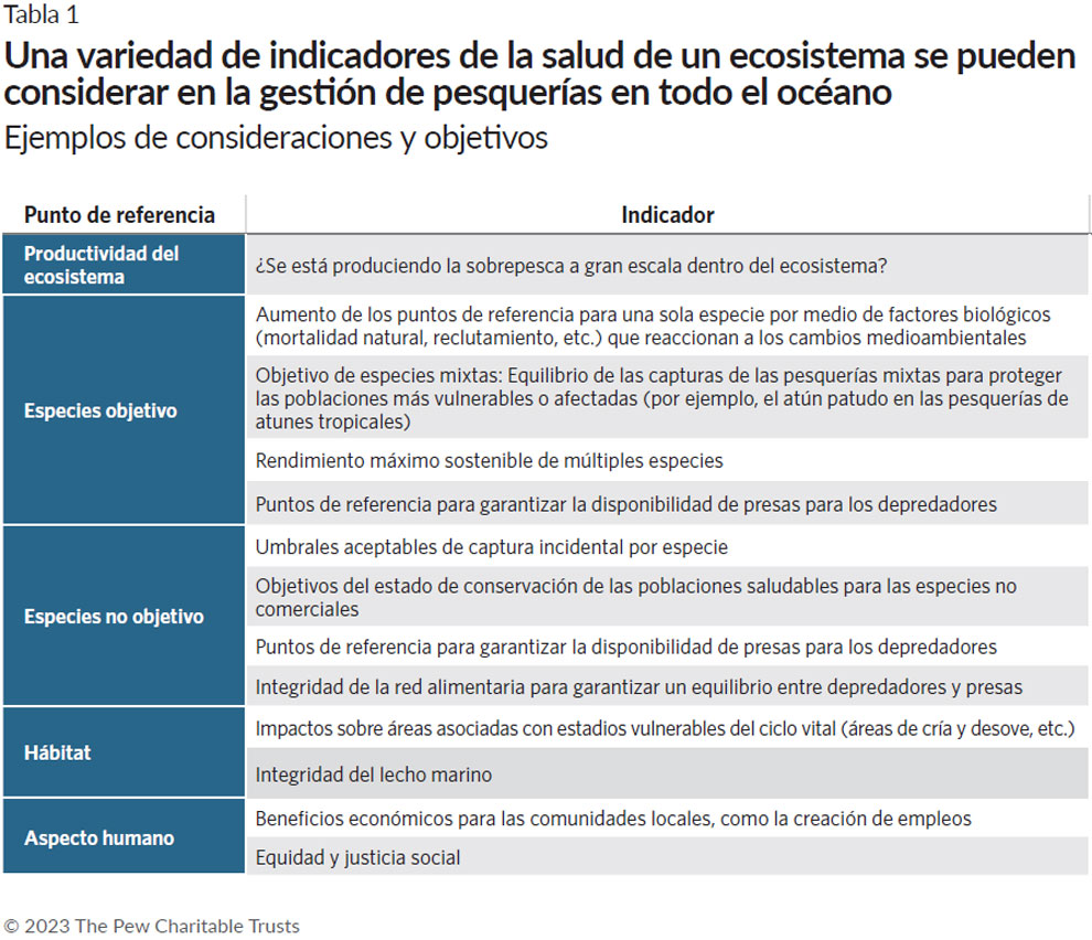 Los gestores de pesquerías también están considerando implementar puntos de referencia, incluidos los indicadores de la salud de un ecosistema (es decir, métricas que ayudan a determinar las acciones de gestión necesarias en función de las condiciones del hábitat en su conjunto), para supervisar los impactos que tienen las pesquerías que capturan atunes tropicales sobre la red alimentaria del océano.4 Los indicadores de la salud de un ecosistema asociados a estos esfuerzos de captura podrían incluir la temperatura de la superficie del mar, las concentraciones de clorofila o zooplancton y las tendencias en las principales oscilaciones de temperatura del océano, tales como el fenómeno de El Niño. Otro indicador posible es el total de biomasa capturada, independientemente de la especie, por nivel trófico, lo que podría ayudar a los gestores de pesquerías a evaluar algunos elementos del ecosistema. Sin embargo, esta herramienta debería usarse con precaución para asegurarse de que la biomasa general no supere los niveles saludables necesarios de poblaciones de especies individuales.