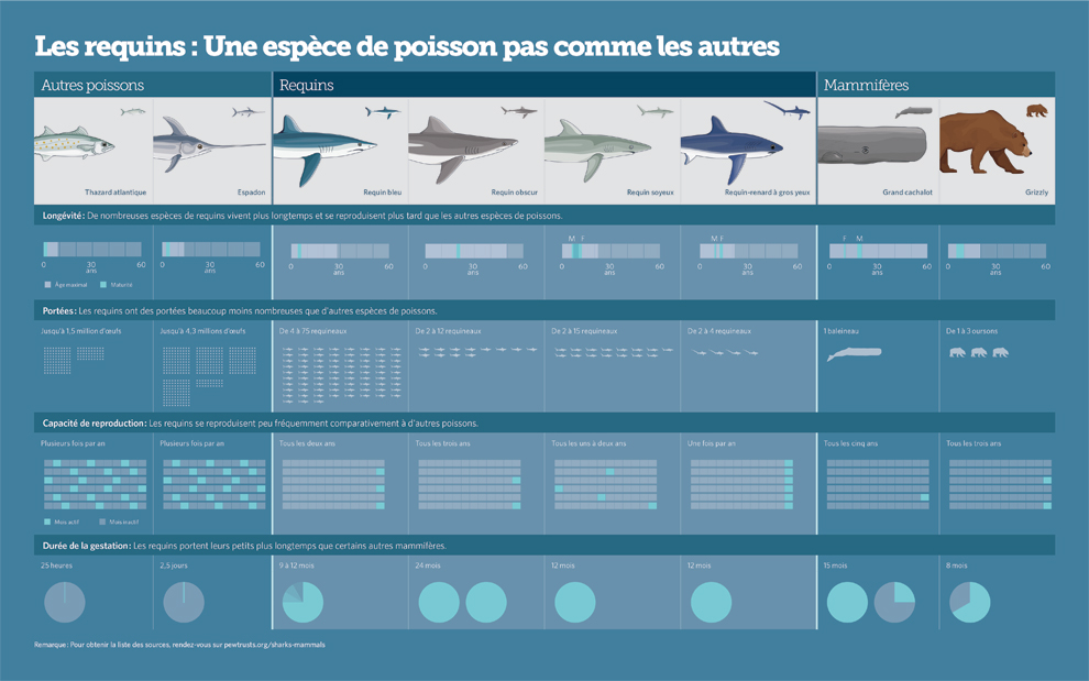 En général, les poissons osseux atteignent la maturité sexuelle tôt, se reproduisent souvent et leurs portées sontnombreuses (Poisson and Fauvel 2009). Par comparaison, les requins grandissent lentement, parviennent à maturitéplus tard et ont des portées peu nombreuses (Simpfendorfer et al. 2008). Par exemple, une femelle requin qui donneraitnaissance à 10 requineaux tous les deux ans pendant 20 ans ajouterait environ 100 individus à la population. À l'inverse,une femelle espadon peut donner naissance à des millions de petits au cours de sa vie reproductive, dont des millierspeuvent survivre (Poisson and Fauvel 2009).