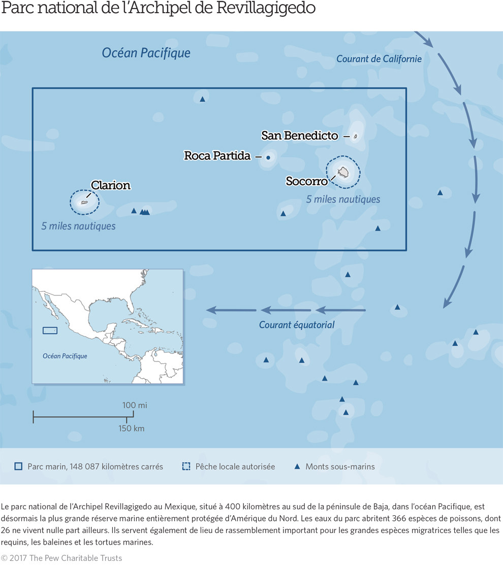 Le parc national de l’Archipel Revillagigedo au Mexique, situé à 400 kilomètres au sud de la péninsule de Baja, dans l’océan Pacifique, est désormais la plus grande réserve marine entièrement protégée d’Amérique du Nord. Les eaux du parc abritent 366 espèces de poissons, dont 26 ne vivent nulle part ailleurs. Ils servent également de lieu de rassemblement important pour les grandes espèces migratrices telles que les requins, les baleines et les tortues marines.