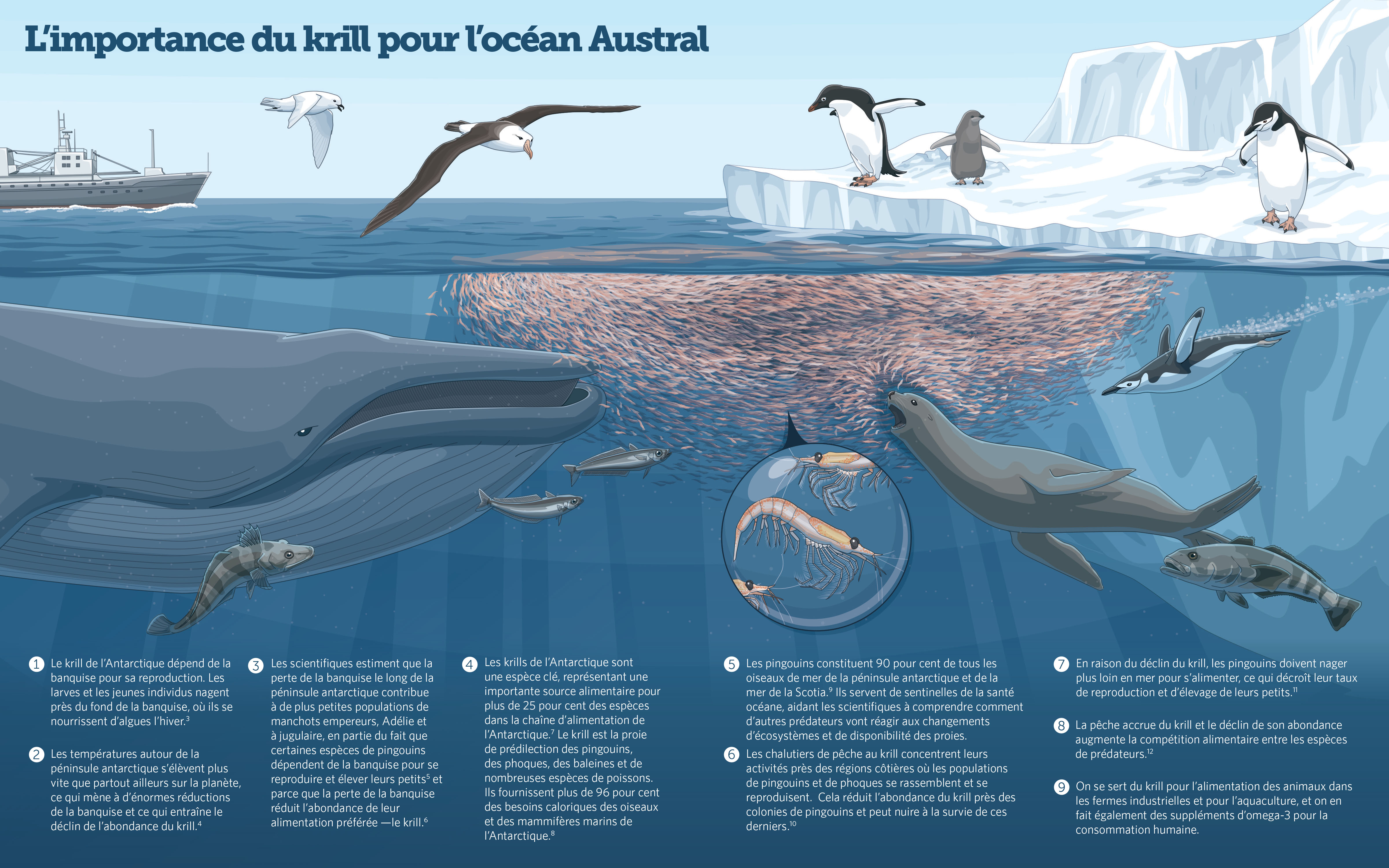 Les krills sont abondants. En fait, les scientifiques estiment que le poids total de tout les krills de l’Antarctique dépasse la totalité du poids de toute autre espèce animale sur la planète. Cependant, l’effet combiné des activités de pêche concentrées et du changement climatique sur les krills - surtout près des côtes de la péninsule antarctique - a des effets négatifs sur la présence du krill dans le secteur de ravitaillement d’espèces comme le manchot à jugulaire et les pingouins d’Adélie, entraînant des répercussions dans la chaîne alimentaire de l’Antarctique.