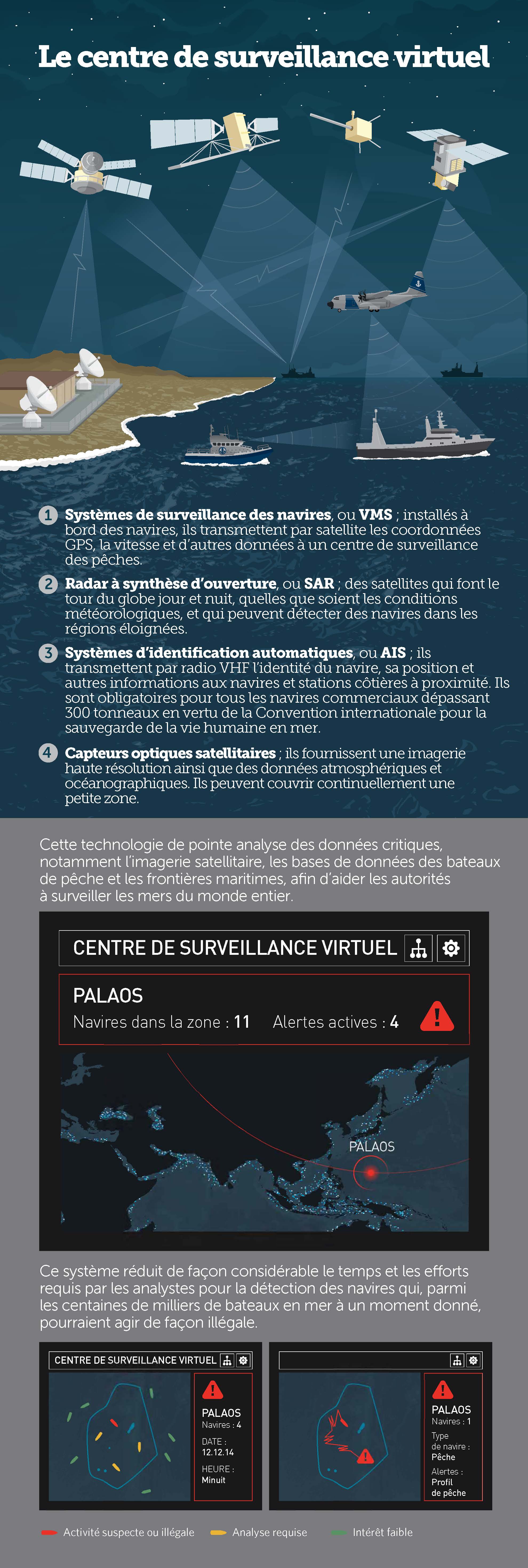 - L’information inclut des données satellites de sources multiples, des bases de données spécialisées concernant les navires, les limites des zones de pêche internationales et des réserves marines, ainsi que des données océaniques comme la profondeur et la température.