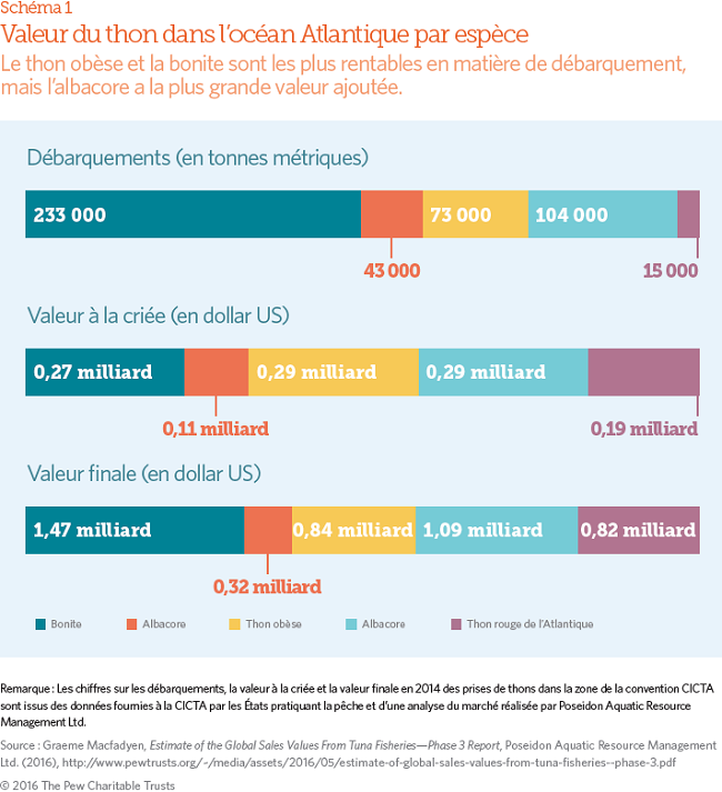 En général, parmi toutes les espèces de thon ciblées par la zone de la convention CICTA, la bonite et l’albacore sont les espèces les plus rentables en raison des énormes volumes de bonites et d’albacores débarqués chaque année. (Cf. Schéma 1.) Les thons capturés à la palangre (thon obèse, thon rouge et albacore) rapportent plus au kilo que les thons pêchés à la senne (bonite, albacore). Les palangriers tirent un bon prix du thon obèse, ce qui en fait le thon le plus rentable au débarquement de tous les thonidés pêchés en Atlantique, suivi de près par la bonite et l’albacore.