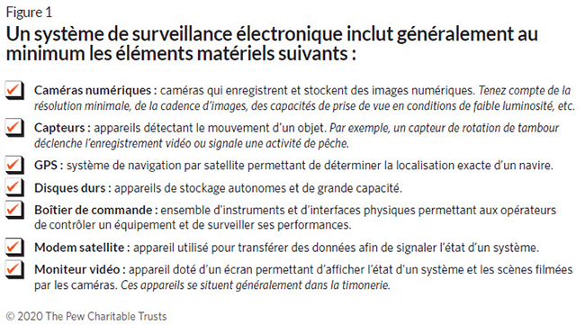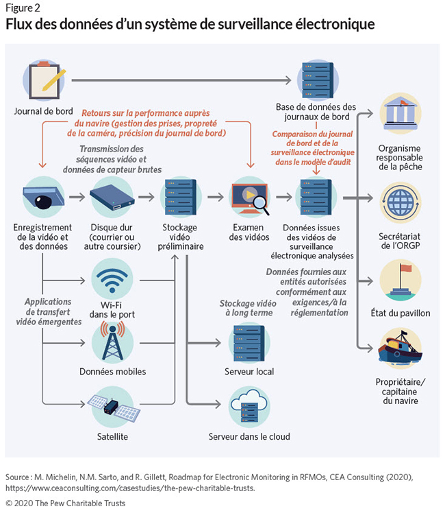 Après avoir déterminé les objectifs et la structure du programme de surveillance électronique, les gestionnaires des pêcheries doivent décider comment collecter, transmettre et stocker les données obtenues. Différentes combinaisons de technologies peuvent être utilisées pour satisfaire aux exigences d’un programme et exploiter au mieux les ressources disponibles. (Cf. Figure 1.) Un programme de surveillance électronique efficace inclut des normes strictes qui garantissent l’uniformité des pratiques de collecte et d’examen des données entre les pays et les flottes.